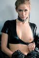 She’s wearing a hot latex top, micro skirt and over-knee ballet boots. And she’s also collared.